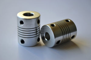 An aluminum flexible coupler used to connect two rotating shafts. Most often used to connect motors to lead screws, the design accounts for any slight misalignment between both shafts and allows for connecting shafts of different diameters.