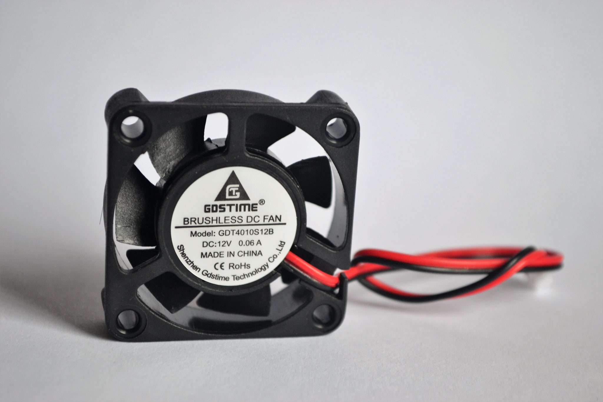 This 12-volt cooling fan is a great replacement or addition to your 3D printer or other project. It measures 40mm x 40mm x 10mm, and has a standard 2-pin plug.