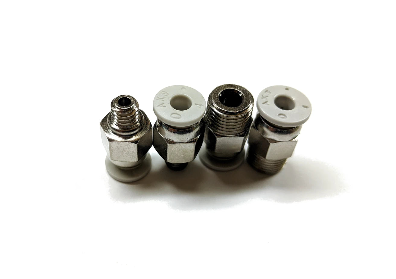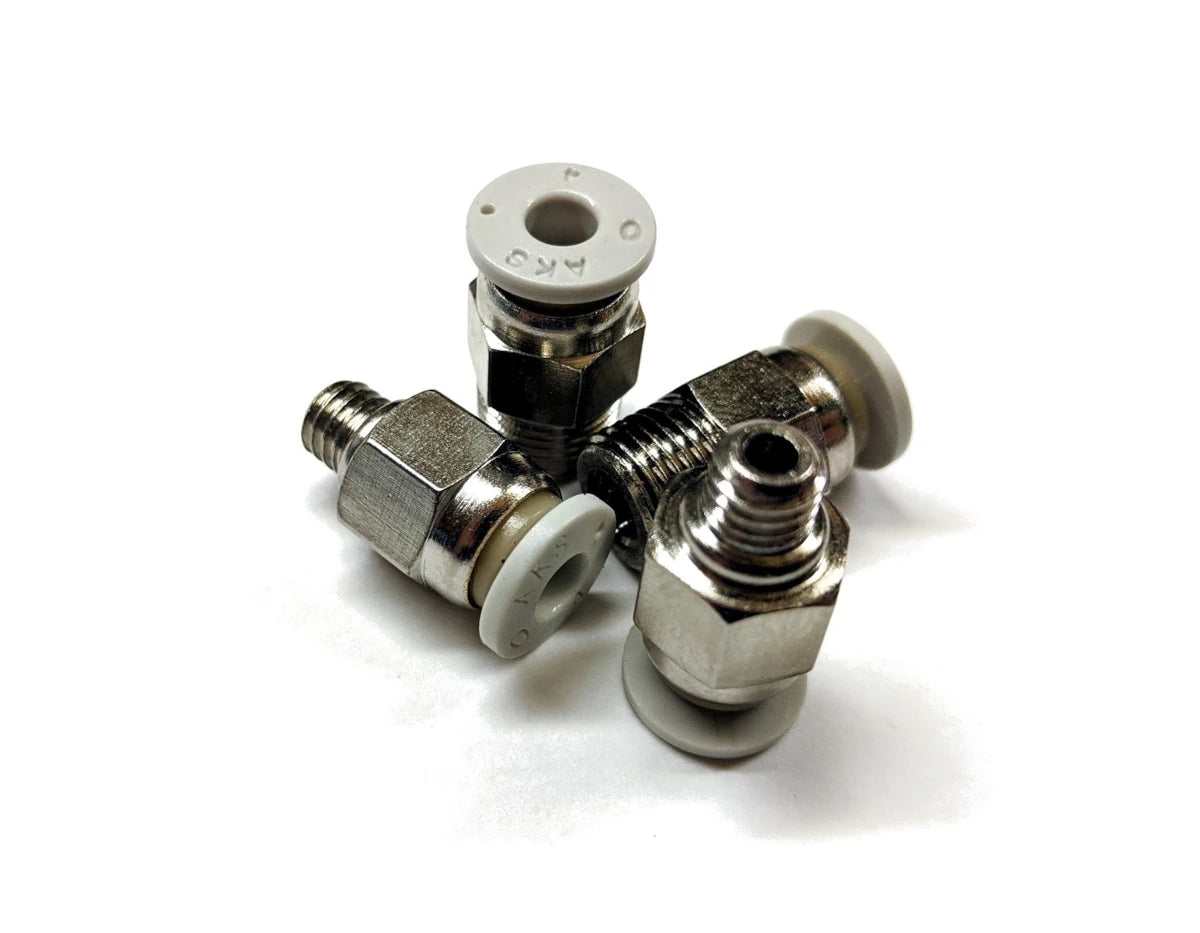 This is a set of replacement pneumatic push-to-connect fittings for most Creality 3d printers using a bowden tube between the printers extruder motor and hotend. This set includes one PC4-M6 fitting for use on the motor/extruder side of the bowden tube, and one PC4-M10x0.9 fitting for use with the stock hotend.