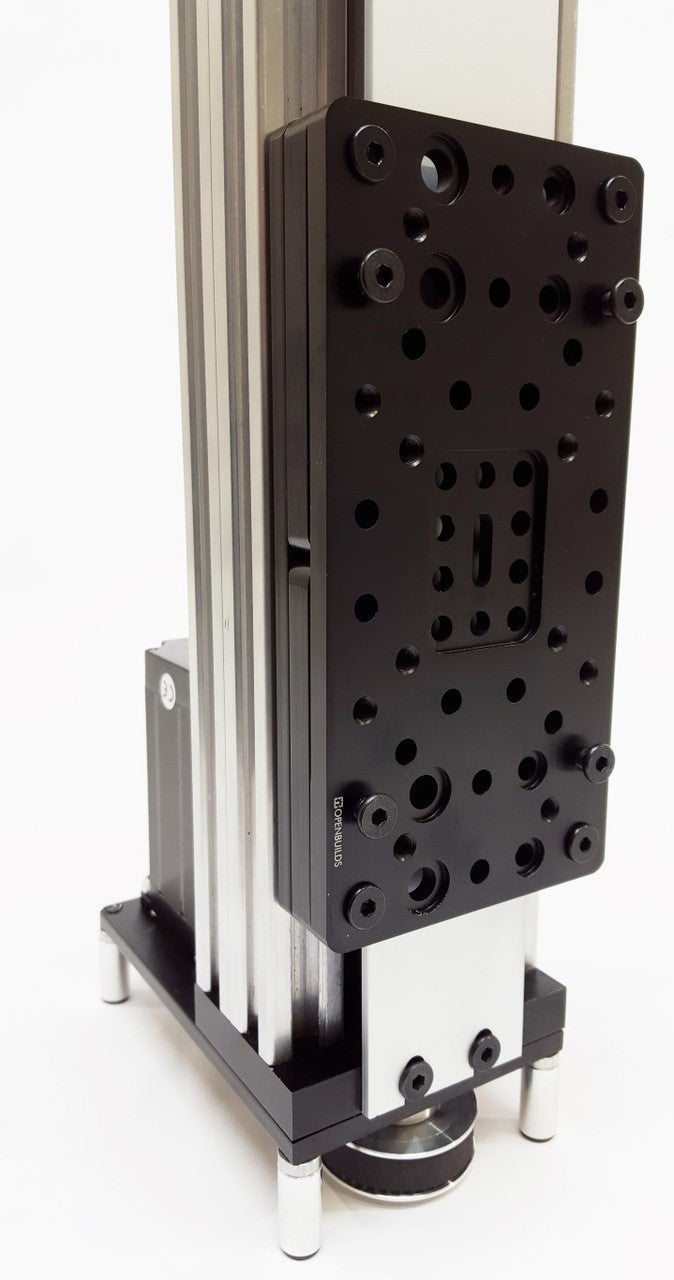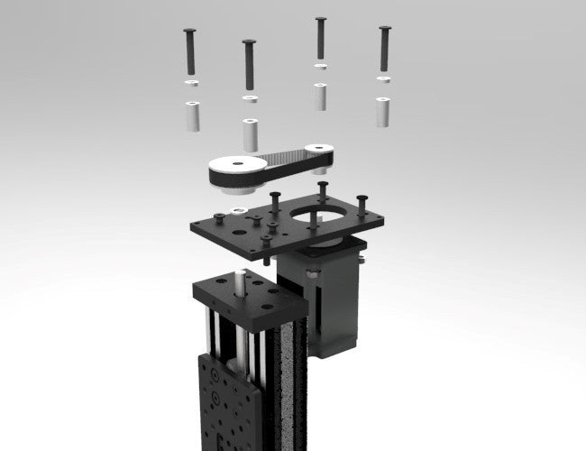 This kit allows you to relocate the Nema 23 motor from the end of your linear rail to increase clearance around your design, and/or change the drive ratio between the motor and the Lead Screw. (Changing the drive ratio requires purchasing pulleys with different tooth-counts) The Standoff plate mounts directly to C-beam rails or the C-Beam end mount plates.