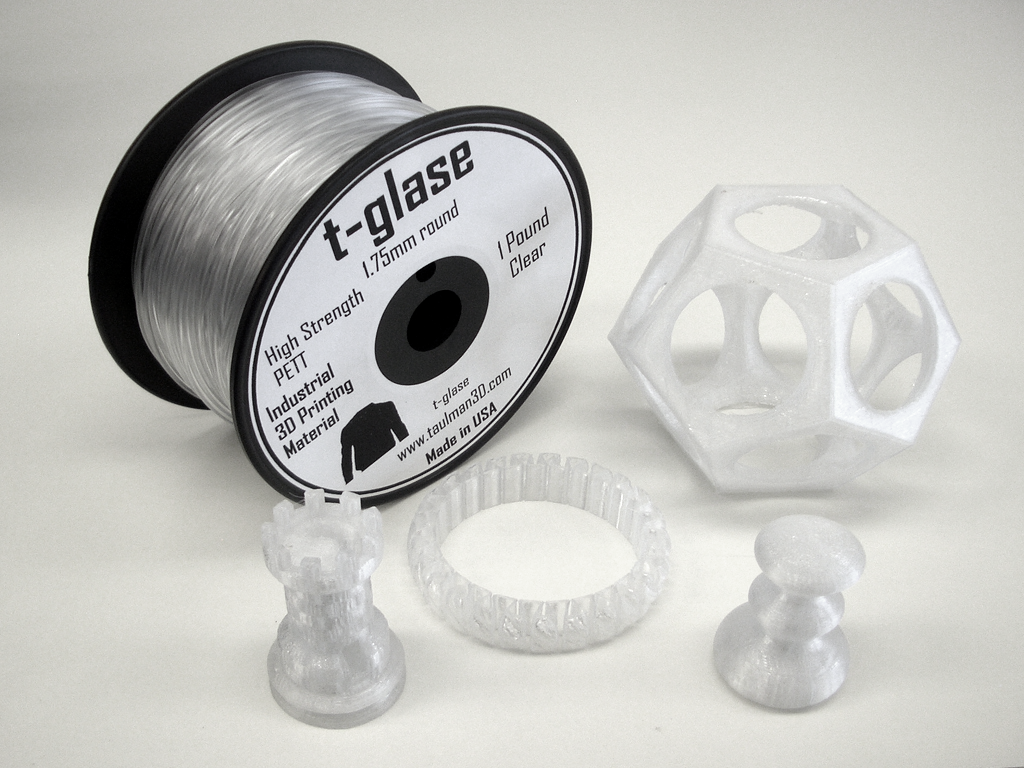 T-glase was developed specifically by Taulman3D to provide three major features to 3D printing. Low shrinkage, higher strength than ABS, and aesthetics beyond ABS and PLA due to it's enhanced optical properties.