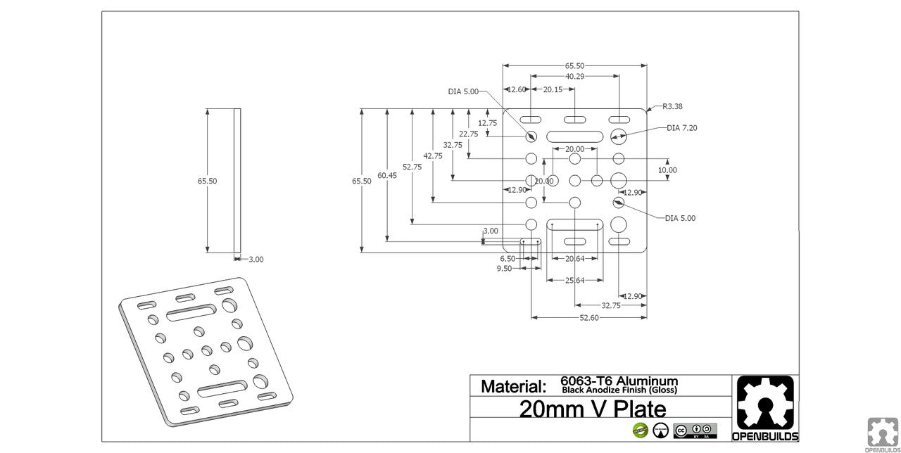 - 20mm - This plate was designed to be used when a smaller, lighter plate is desired on the 20mm side of V-Slot. This plate is great when full size wheels are preferred along with a smaller foot print needed.
